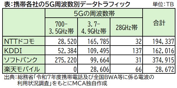 上記の表からも分かるように、NTTドコモは「700-3.5GHz帯」の4G周波数帯の5G転用が約15%なのに対し、ソフトバンクは約73%と5G転用を積極的に進めてきたことが、その背景としてありそうだ。