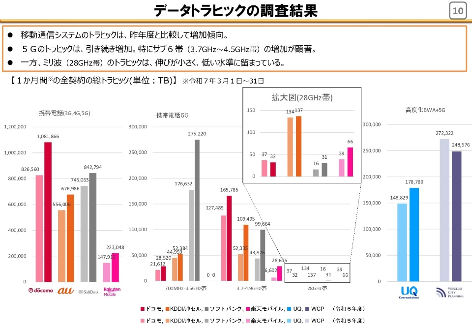 データからも明らかなように、5G基地局数は増加を続けているが、通信トラフィックの伸びはサブ6帯(3.7~4.5GHz)が中心で、28GHzミリ波の利用は依然として限定的である。これは、5Gの主戦場が通信速度よりも“面のカバレッジと混雑耐性”にあることを示している。