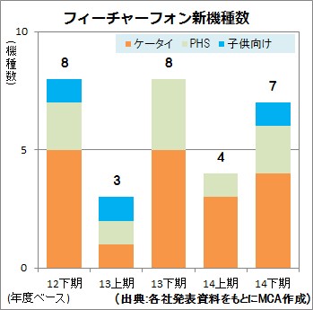 その結果、2014年度の新機種数は2013年度と同水準を維持していることが分かった。新機種発表会ではスマートフォンやタブレット、新サービスの影に隠れがちだが、フィーチャーフォンもコンスタントに新機種が発売されているといえるだろう。