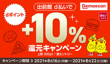 といったちょっとした注意点はあるものの、使ってみると、dポイントユーザーにとって、貯めたポイントを使える場所として「出前館」は便利なサービス。折しも8月16日~22日には「+10%還元」(上限500ポイント)が始まりました。これからもちょくちょく頼りたいところです。