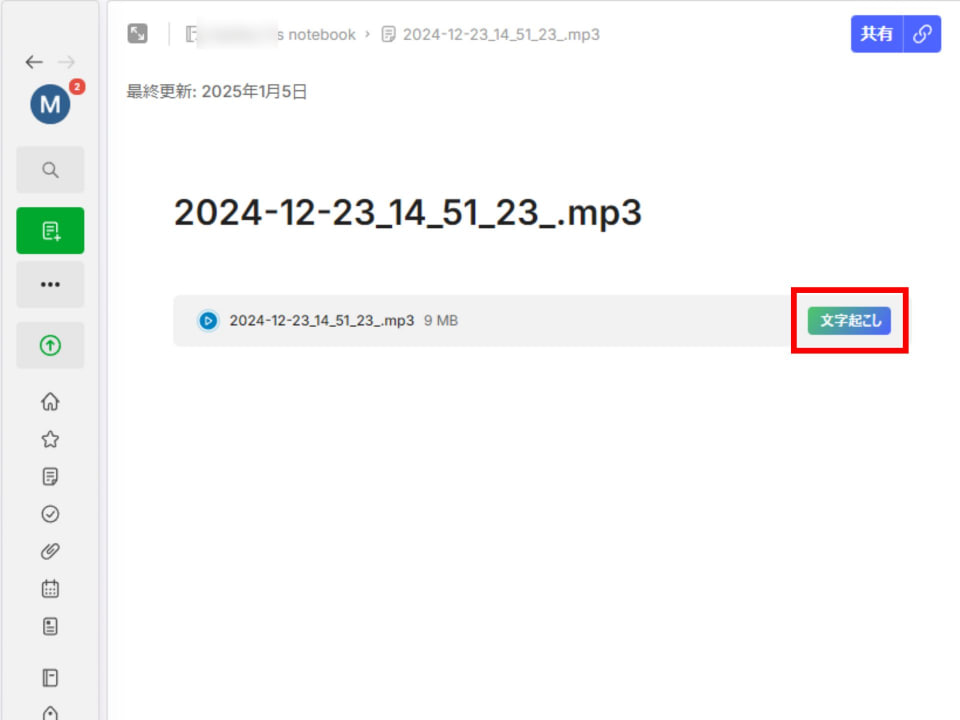 「サクッとEvernoteから仕事用フォルダに移し替えるか~」と、PCのEvernoteアプリを開いたところ、「文字起こし」ボタンが表示されている。