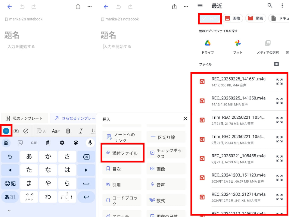 取材終了後に録音データを保存し、Evernoteへアップする。もしくはEvernoteで新規ノートを立ち上げて、「添付ファイル」から録音データを探して添付しても良い。添付が完了すると、「文字起こし」のボタンが現れて、その場で文字起こしを行える。