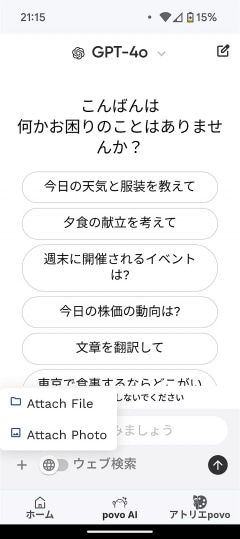 いわゆるチャット形式で、こちらから、質問したりお願いしたりすると、それにAIが答えてくれます。ありがちと言えばありがちですが、注目すべきは「povo AI」は、「GPT-4o」「o3-mini」「GPT-3.5」「Perplexity Sonar Pro」という生成AIを利用できること。4つのAIのうち、前者3つは、ChatGPTでおなじみのOpenAIが開発したものです。