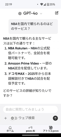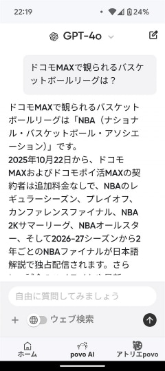 たとえばちょっとした調べ物、あるいは相談事を聞いてみる……というのは、よくある使い方でしょうか。どこまで新しい情報に対応しているのか、「GPT-4o」でちょっと試しに「ドコモMAXで観られるバスケットボールリーグは?」と聞いてみました。発表されて間もなく、しかもKDDIの競合であるNTTドコモの情報をカバーできているのか……と少しだけ待つと、8月4日に発表されたばかりの「NBA」の情報を返してきました。うむ。ちなみに「NBAを国内で観られるサービスは?」と質問してみると、ちょっと古い情報と、これからの情報が混ざって表示されました。このあたりは検索に強みを持つ、Perplexityのほうがいいかもしれません。