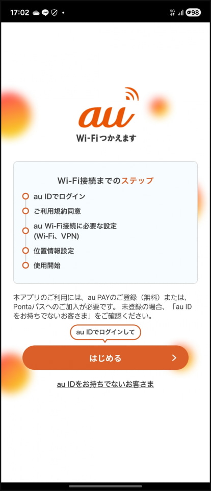 「au Wi-Fiアクセス」のアプリそのものはインストールされ、ひとまず、起動するんだけど、画面内の「はじめる」ボタンをタップしても一瞬、動きそうに見えて、反応なし。