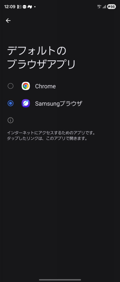 ただ、他のSIMフリー端末を試しているとき、ふと思い出したのがブラウザの設定。GalaxyシリーズにはAndroidプラットフォーム標準の「Chrome」のほかに、「Samsungブラウザ」がインストールされている。「Galaxy Z Fold7」では「Samsungブラウザ」が「デフォルトのブラウザアプリ」に設定されており、これを「Chrome」に切り替えてみると、「au Wi-Fiアクセス」アプリのセットアップが正しく動作し、アプリが利用できるようになった。