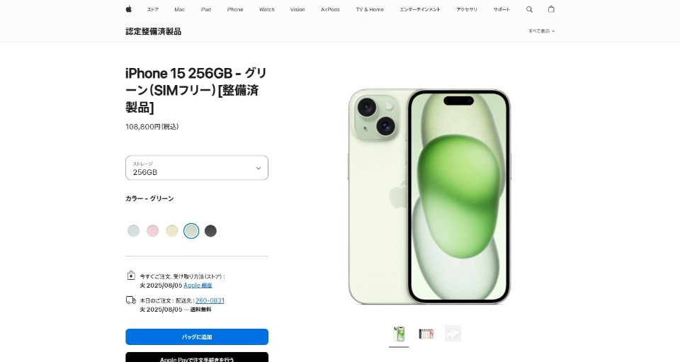 最近、アップルオンラインストアの「整備済製品」のコーナーにiPhone 15が並びはじめました。筆者の狙いはグリーン。淡い青リンゴのような色味で、見るたびに「これだよなー」と思っていたのです(昨年は事情があって新品を買わずに我慢したのですが、それは割愛)。