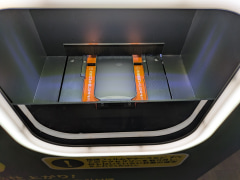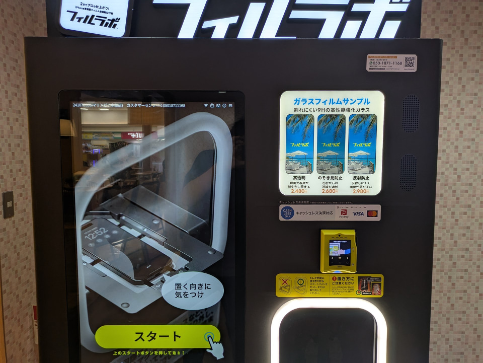 支払いはPayPayやクレジットカードで可能。決済後、自販機の口が開き、施工台がせり出します。ここにiPhoneを置くと台が中に引き込まれ、ブオーッという風とともに画面をクリーニング。ブラシのような音もして、かなり本格的です。そして再び台が出てくると……おお、フィルムが貼られたiPhoneが!