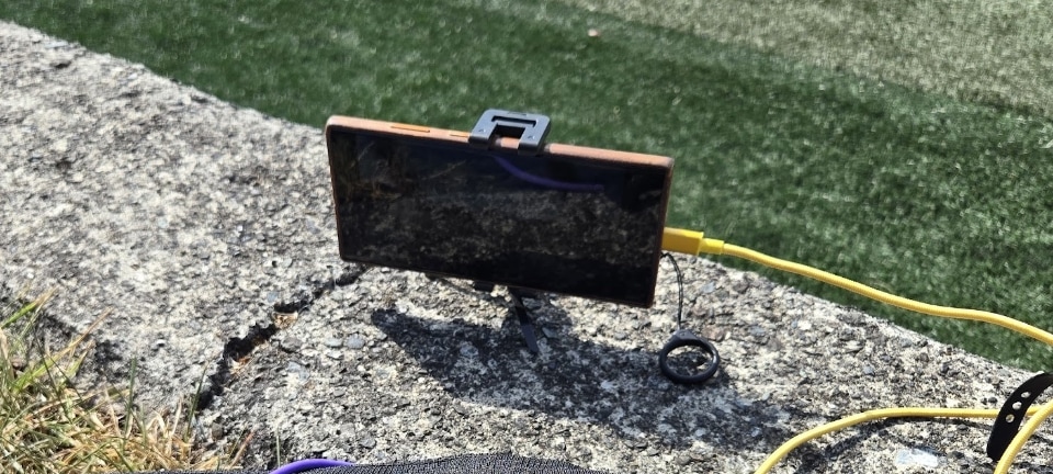 そんな中での屋外スポーツは、人間だけでなくスマートフォンにも負荷が大きく、直射日光が当たる状況でスマートフォンを充電しながら数十分連続で動画撮影していると、温度上昇により録画が中断されてしまいました。