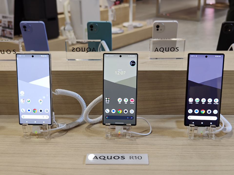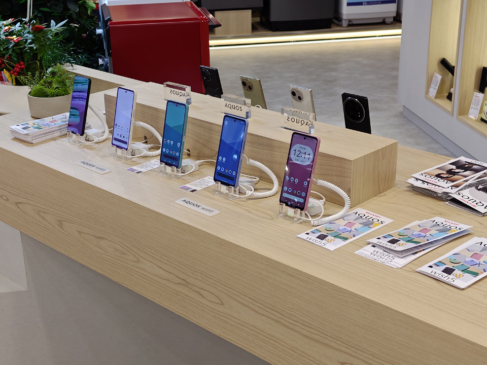 しかし今ではAQUOS Wish5とAQUOS R10を全色展示。端末を自由に取って試せるように置いています。日本でもここまで綺麗に展示している店舗はあまりないかもしれません。
