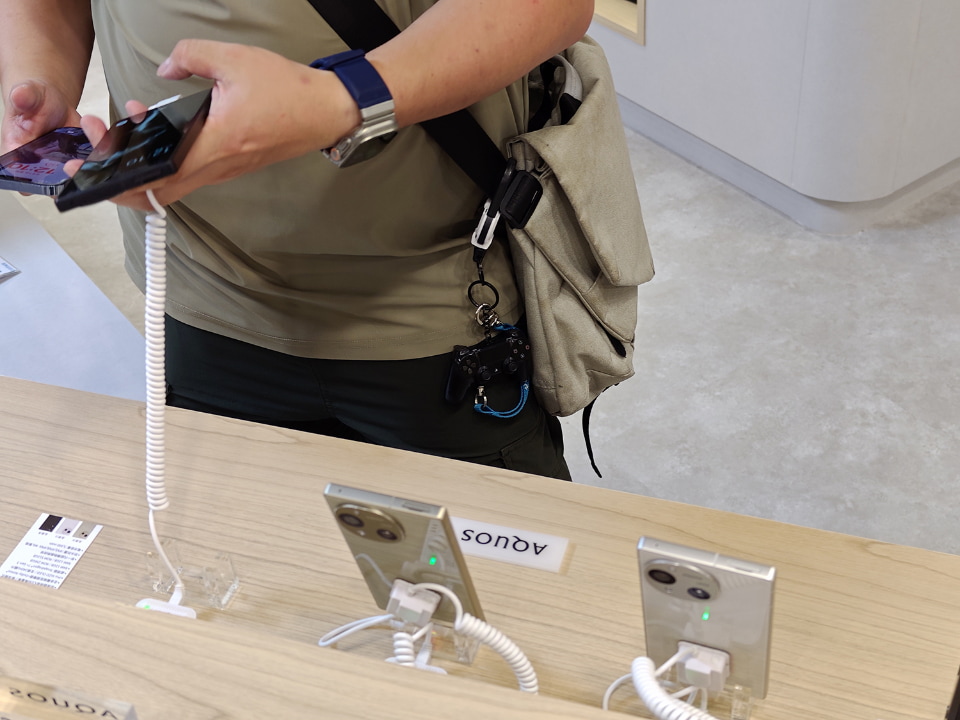 筆者が訪問したのは平日昼間でしたが、何かの用事に来たらしきお客さんが、帰り際にAQUOS R10を触っていました。しかも自分のiPhoneとカメラの比較などを行っていたのです。ここに展示することですぐに売れる、とはいかないかもしれません。