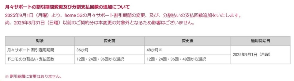 2つ目は、9月1日以降home 5Gの月々サポート期間が従来の最大36カ月から最大48カ月に変更される、というものです。home 5G HR02の場合、月々サポート期間が36カ月の割引額は毎月2035円ですが、48カ月になると1526円に減少します。