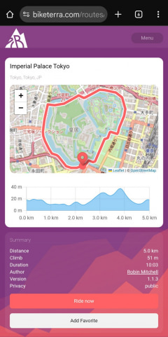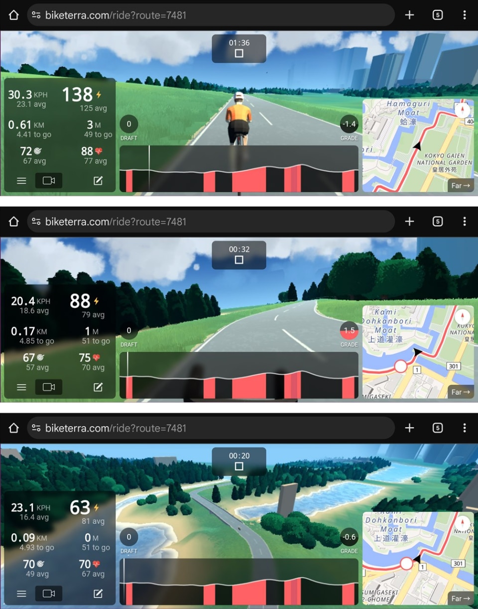 もう1つBiketerraがユニークなのは、世界中の実在する道路を模したコースを走れること。ツール・ド・フランスの舞台となっているコースもあれば、日本の皇居周辺の周回路を再現したものもある。トータル3万2000kmにも及ぶコースが用意されているうえ、FITファイルやGPXファイルなどをアップロードして独自のコースを作ることもできるので、大会のコースを再現してトレーニングやシミュレーションに使うのもアリだ。