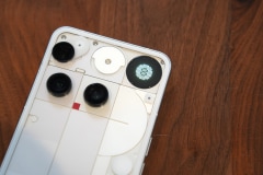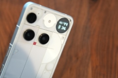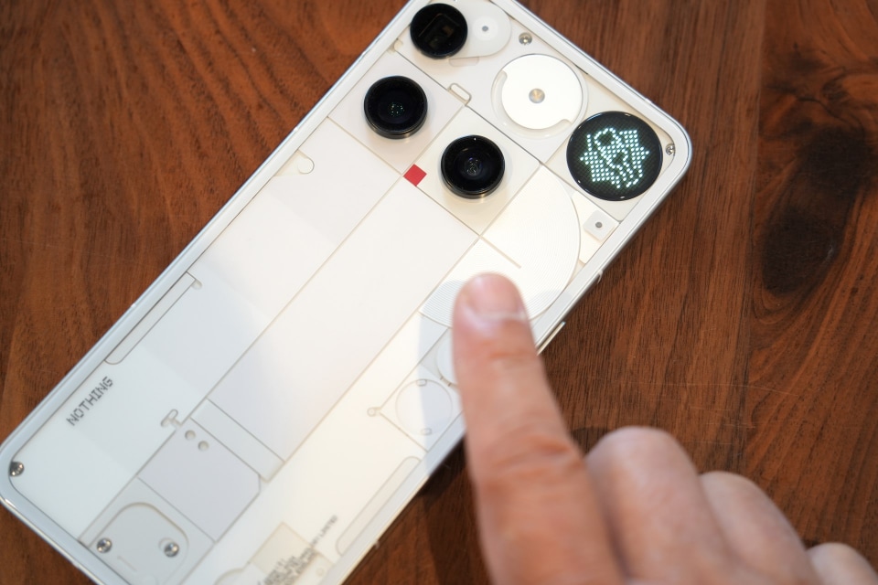 長押しでGlyphマトリックスをミラーのように使えて、再度、長押しすると、背面カメラで自撮りができるというもの。「ミラー」と言っても粗いドットで表示されるので、表情までは確認できませんが、背面の高画素カメラで自撮りをしたい人には重宝しそうです。