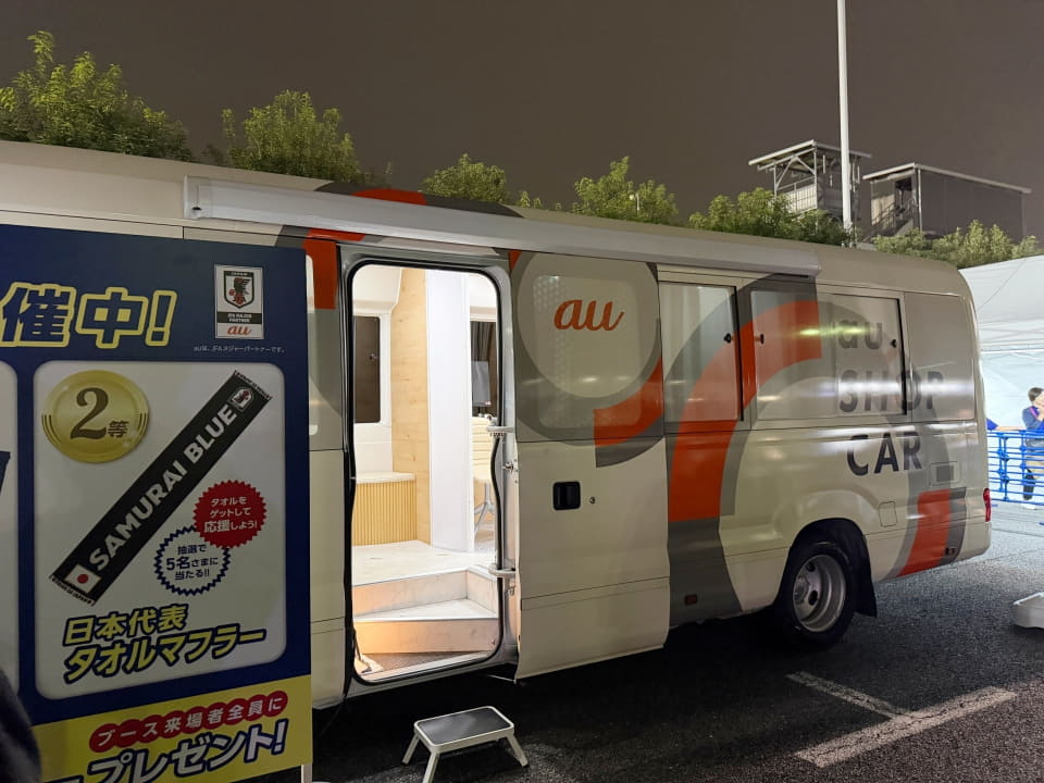 サッカーの話はいくらでもできますが、今回はKDDIブースの話です。試合開催時には、スタジアムの周辺にさまざまな企業ブースが出店されており、その一角にKDDIブースも並んでいる格好となっています。
