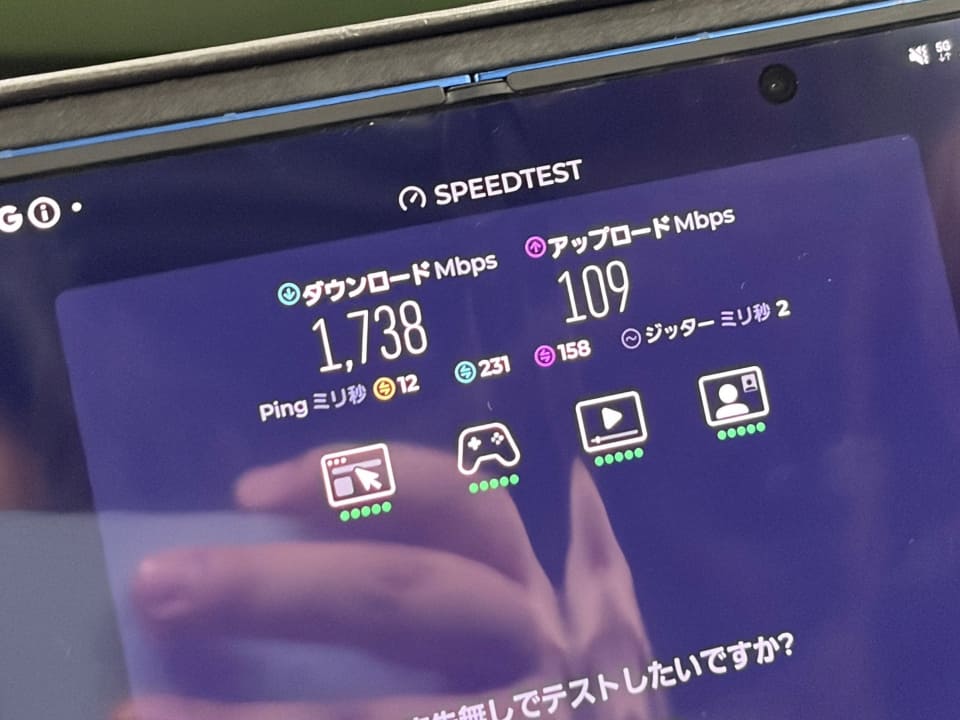 ちなみに、スタンドでスピードテストを行ったところ、ダウンロード1738Mbps、アップロード109Mbpsの超高速通信がおこなえました。