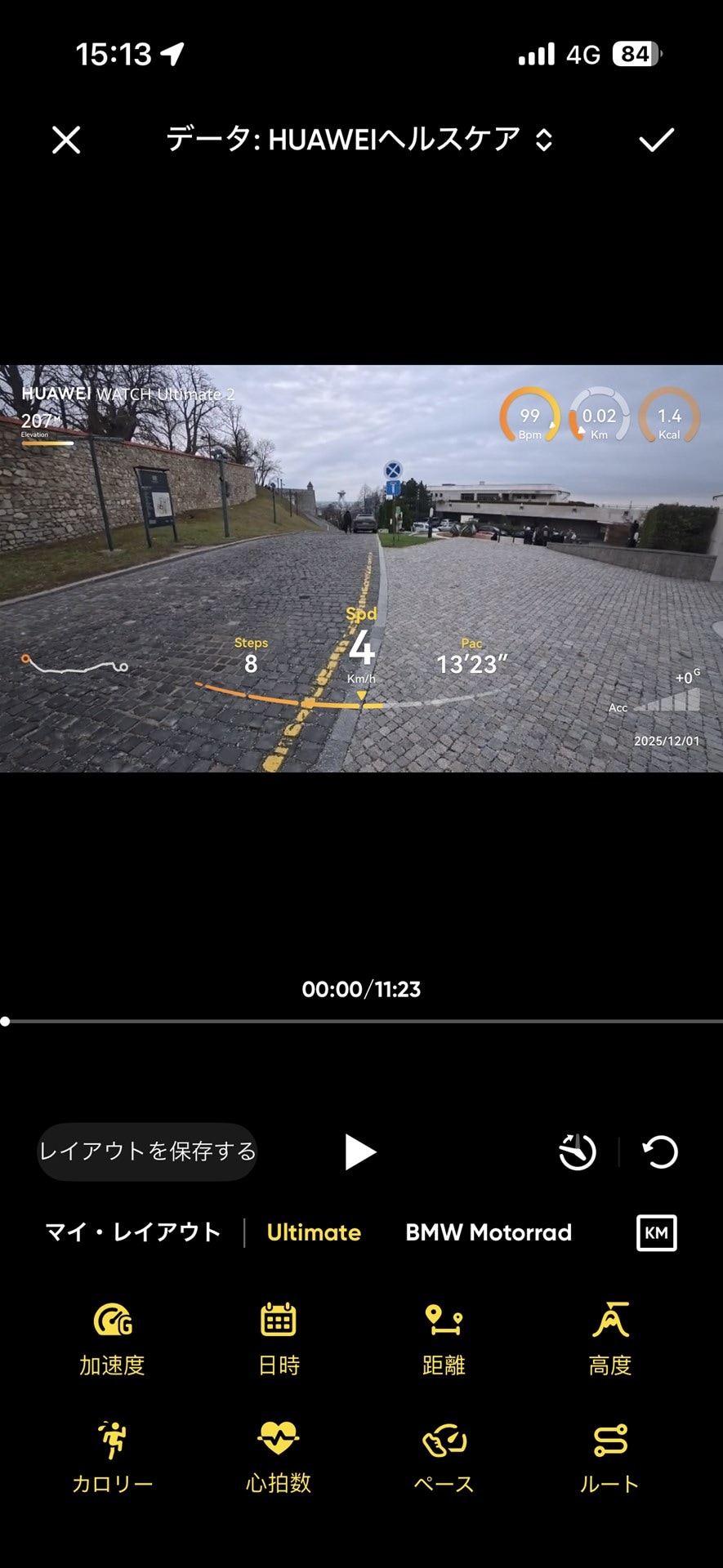 するとワークアウトで取得したデータを、映像上に表示できるようになります。表示できるのは「加速度」、「日時」、「距離」、「ルート」など8項目。各項目をタップすることで、表示するデータが選択できます。