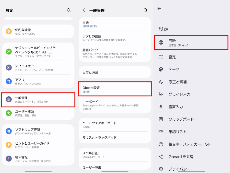 といっても、最近のGalaxyでは物理キーボードを使ったかな入力をしやすくなっている。設定アプリから「一般管理」→「Gboard設定」→「言語」→「日本語 12キー」へと進む。
