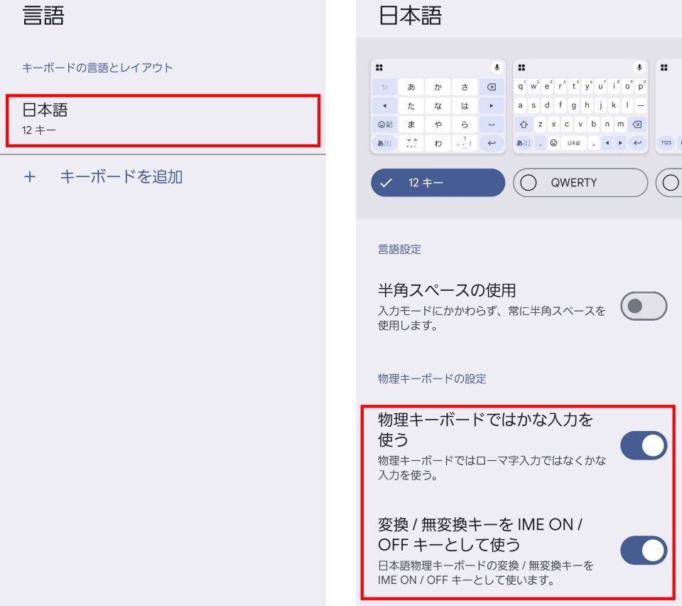この状態で物理キーボードを接続すると「物理キーボードの設定」という項目が表示されるようになる。そして「物理キーボードではかな入力を使う」を有効に、「変換/無変換キーをIME ON/OFFキーとして使う」を有効にしてから元の画面に戻っていけば、どの物理キーボードを接続してもかな入力できるようになるのだ。