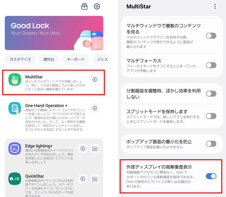 さらに言えば、Google Playから「Good Lock」アプリをダウンロードして、同アプリ内「MultiStar」を有効化し、「外部ディスプレイの高解像度表示」をオンにすれば、ウルトラワイド(32:9)ディスプレイとして使うこともできる。
