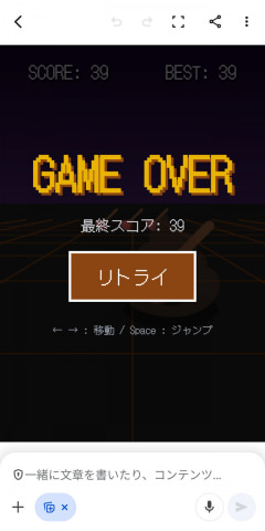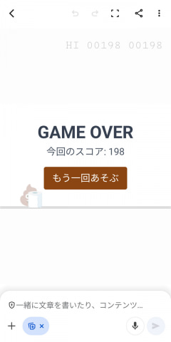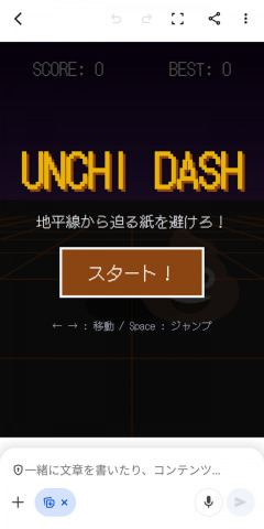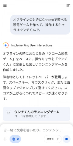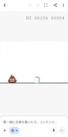 そんなわけで、Geminiアプリで「オフラインのときにChromeで遊べる恐竜ゲームを作って。操作するキャラはウンチくんで」と打ち込む。わずか数十秒で完成し、一応遊べるものができた。絶対にクリアできないタイミングと幅で障害物が出現するなど理不尽なつくりだったが、意外にもそれが子供にとっては楽しかったようだ。