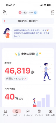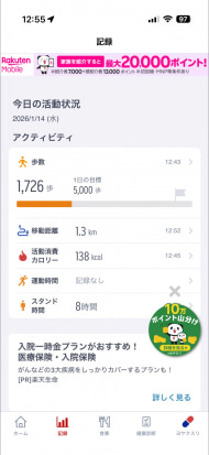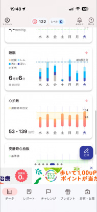 健康に関する情報をさまざま取得できるのが特徴ですが、「自身の健康状態」に着目すると、歩数程度しか見られず、若干散らかっている印象を受けます。健康に関する情報と広く接することができるので、いろいろな情報を得ていきたいという人にいいでしょう。