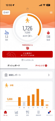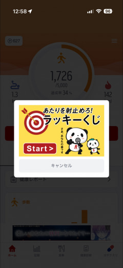楽天ヘルスケアは、歩数などで設定されるチャレンジを達成していくことで、くじ引きの権利が与えられ、くじを引けば楽天ポイントが貯まるという仕組みになります。