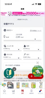 楽天ヘルスケアも、歩数に合わせて消費カロリー、移動距離といったデータを確認できます。「食事」の項目には、毎回の食事を手入力しなければならないのが面倒ですが、摂取した栄養素等もチェックできるようになっているので、自分の身体と向き合うにはいい機能でしょう。