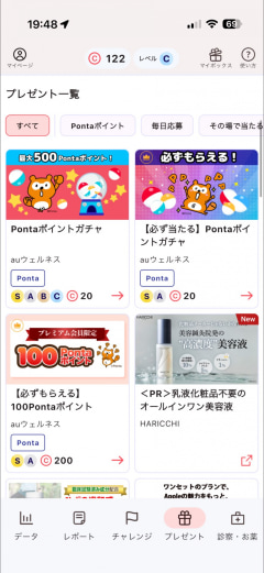 auウェルネスでは、直接Pontaポイントが付与されるのではなく、auウェルネス内で使用するコインを獲得していく格好になります。貯めたコインは、ガチャという形でPontaポイントと交換したり、提携しているキャンペーンへの応募に使ったりできます。