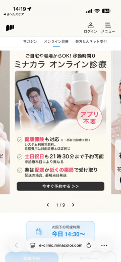 本記事の内容としてはおまけになりますが、dヘルスケアはミナカラオンライン診療と提携しており、アプリからオンライン診療のページを表示することができます。ミナカラオンライン診療には、dアカウントでログインをすることで、面倒な個人情報の入力をある程度省くことも可能です。