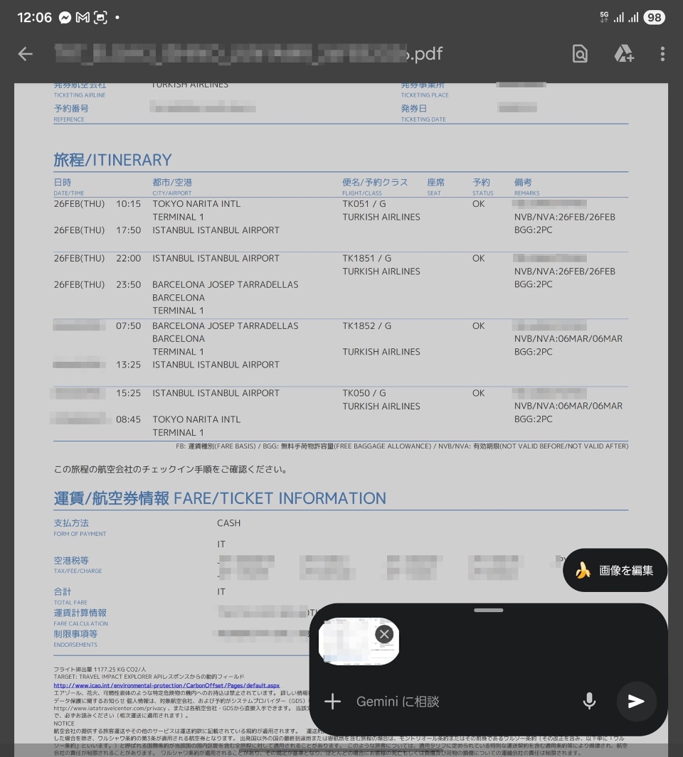 Geminiは、メールだけでなく、メッセンジャーやWebに表示した時間なども一発でカレンダーに登録可能。試しに、PDFで届いた乗り継ぎを含めた計4回のフライトをGeminiにカレンダー登録してもらったが、一発で正確に転記された。行き先はもちろん、便名もきちんと入力され、自分で書き写すよりもきめ細やかだと感じたほどだ。