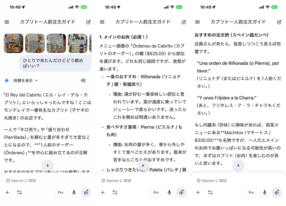 ここで重要なのが、単に「翻訳して」と頼むのではなく、こちらの要望を伝えること。 例えば、「大人3人で来ています。現地の名物を含めて、みんなでシェアしながら食べるのに最適なオーダーの組み合わせを考えて」と投げかけます。