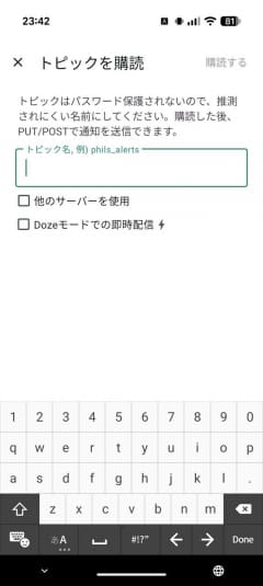 次に「ntfy」というスマホアプリをインストールします。これは、任意の文字列(トピック)を識別用のキーにして通信内容をサーバー~クライアント(パソコンやスマホ)間でやりとりできるようにするツールです。