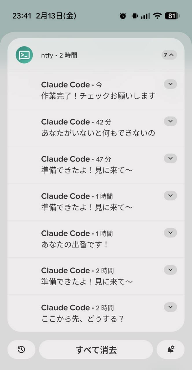 この通知のおかげでClaude Codeを使ったコーディング効率は劇的にアップしました。メッセージが1つしかないとなんとなく飽きてくるので、筆者はnotify.shでたくさんのメッセージパターンを設定しています。Claude Code先生のいろいろな叫びが聞けて楽しい感じ。じっくりマイペースでバイブコーディングしていきたい方におすすめです。