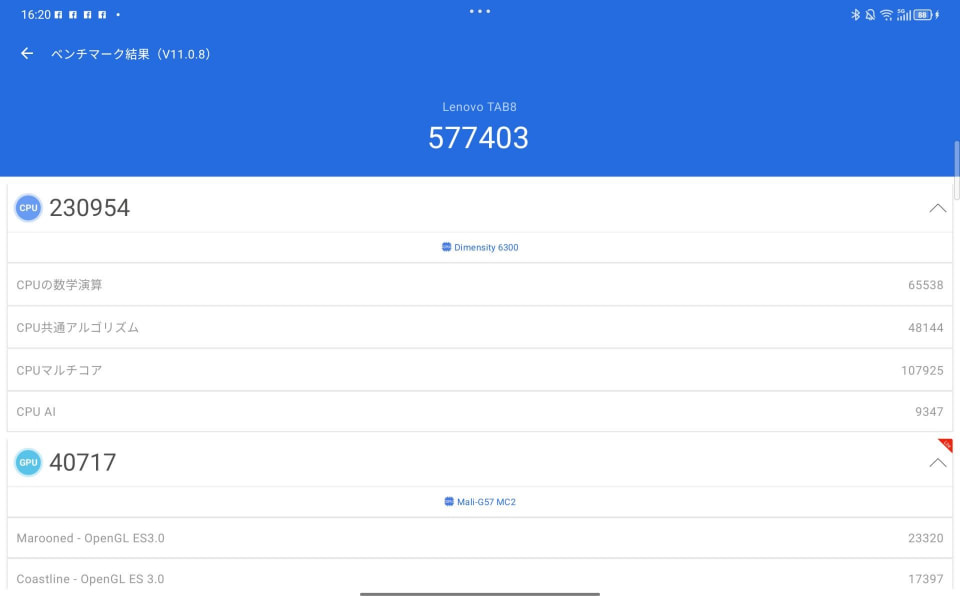 ではLenovo Tab8のベンチマークはどうなっているのだろうか。「AnTuTu v11.0.8」でテストしたところ、57万7403というスコアが表示された。どうしようもないほど低くはないが、エントリークラスであることに違いはない。