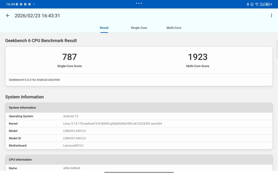 「Geekbench 6」ではシングルコアが787、マルチコアで1923というスコアになった。同じSoC(Dimensity 6300)を使ったSamsung Galaxy A06(5G)と同程度である。