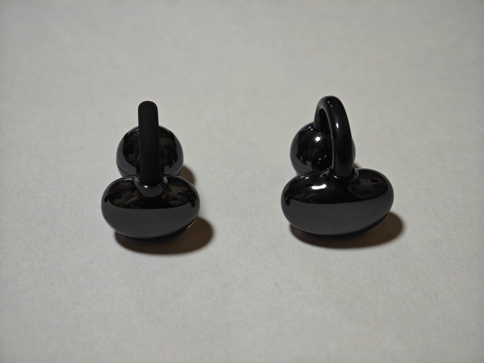 イヤホン本体も小さくなっていて、単体イヤホンの重さは初代が約5.6gのところ2は約5.1gとわずかですが軽くなりました。耳に入れる方はボール、耳の後ろに当たる方はビーンと呼ばれていますが、ビーンが初代より明らかに小さくなっています。