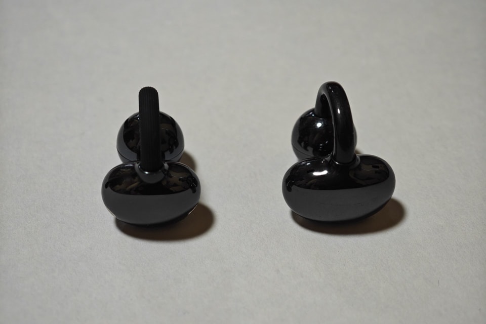 初代同様、2もイヤホンに左右の区別はありません。ケースから取り出して耳にはさむだけで、左右が自動で認識されますが、初代を使っていて違和感を覚えたことは一度もありません。装着時は前後を確認して耳の端に当て、押し込むとスルッと入っていきます。