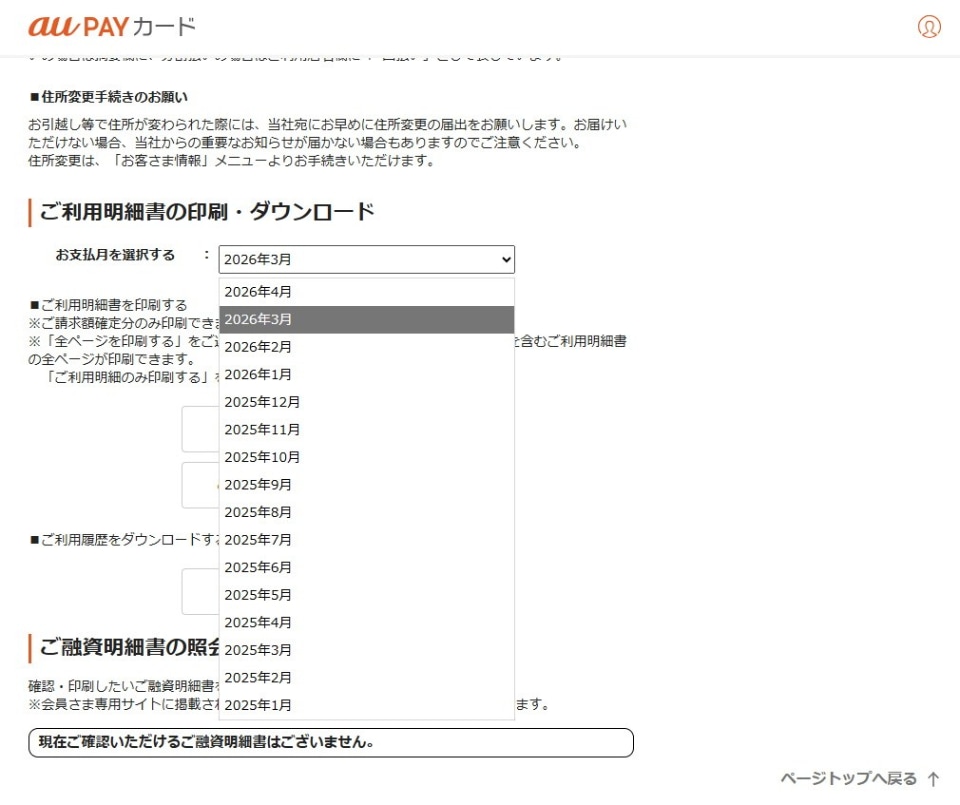 じゃあ、画面表示の指示に従って、au PAYカードの会員サイトを表示してみましょうってことで、チェックしてみたんだけど、ここに表示されるのはau PAYカードの明細だけで、au PAYの支払い明細は表示されない。つまり、前述の「au PAY 残高オートチャージ(一定額)」が表示されるだけで、店舗名や支払い日時、金額などの情報は確認できない。ということは、2025年9月以前にau PAYで支払った明細は参照できない? 明細がないってことは領収書をもらい忘れたり、なくしたりすると、経費に計上できないし、いい加減にまとめると、国税庁や税務署にツッコまれ……。