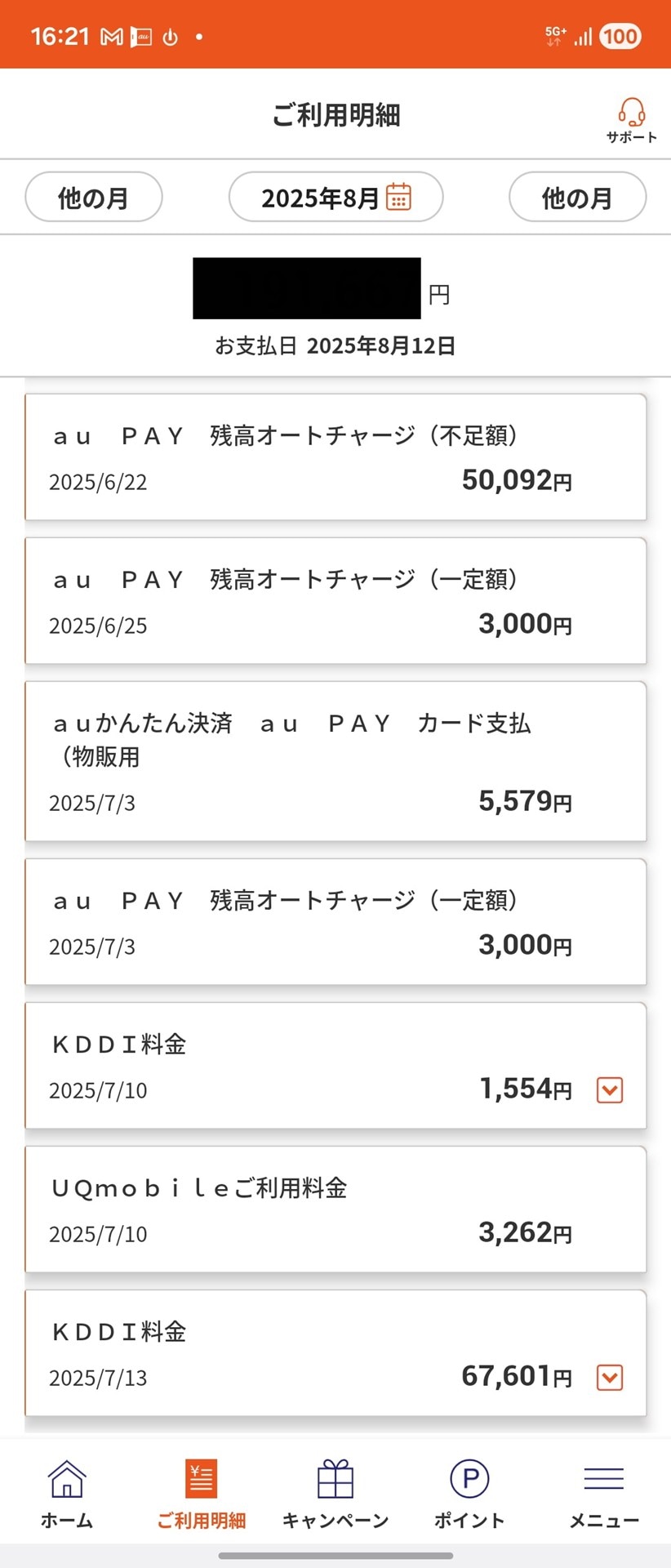 「au PAY」の支払い明細は6カ月前まで?