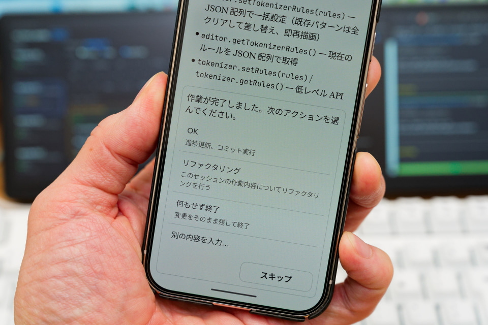 ただ動作状況を見守るだけでなく、指示を出したり、AIエージェントからの質問に答えたり、コマンド実行などの許可を出したり、といったひと通りの操作ができるので、まさにリモコン。食事の合間にも、トイレで踏ん張っている最中も、ごろりと寝転がって休憩しているときでも、いつでも進捗を確認できます。