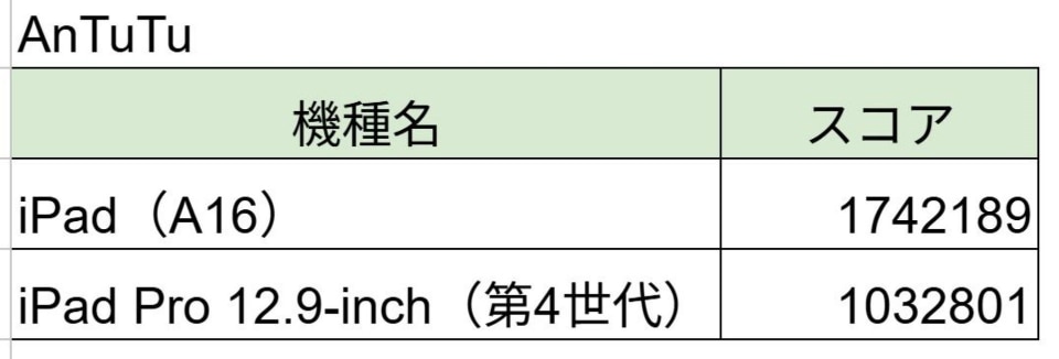 AnTuTuでは、iPad(A16)のスコアが「1742189」、iPad Pro 12.9-inch(第4世代)が「1032801」であった。