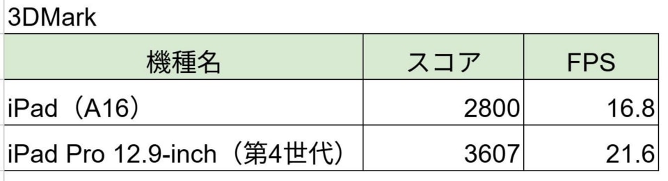 3DMarkでは、「Wild Life Extreme」でテストをした。こちらのスコアはiPad(A16)が「2800」、フレームレートは「16.8FPS」だったのに対し、iPad Pro 12.9-inch(第4世代)はスコアが「3607」、フレームレート「21.6FPS」と高い値を示していた。