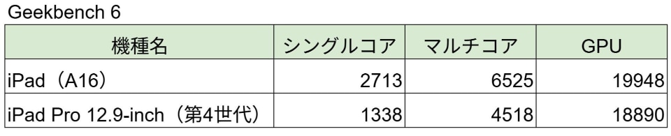 その検証は後ほど行うとして、気になることがある。5年前に大枚をはたいて購入した「iPad Pro 12.9-inch 第4世代(チップセットはA12Z)」と160円×24カ月(48回払いだが、24カ月で手放す予定)で手に入れたiPad(A16)では、処理速度にどれだけの違いが出るのだろうか。
