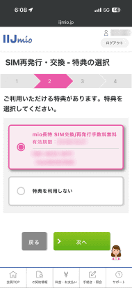 契約しているIIJmio(正確にはBIC SIM)には長期利用特典「mio長特」があり、データ容量の追加や回線追加時の初期費用割引があるのですが、その中に「SIM交換/再発行手数料」無料があったのを思い出しました。