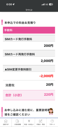筆者も対象でしたので、今回のeSIMの切り替えはこの特典を利用し、交換手数料(2200円)は無料になり、eSIMのSIMプロファイル発行手数料(タイプAで220円)だけで切り替えができました。