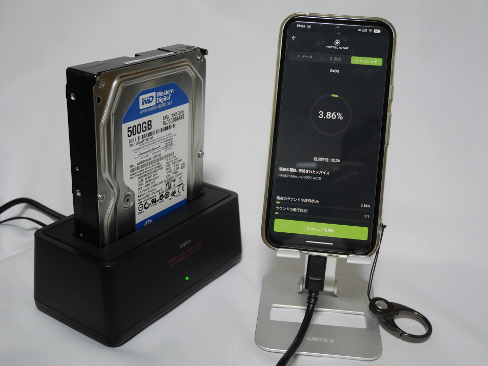3.5インチのハードディスクを動かすだけに、ハードディスクスタンドには別途電源を供給しているとはいえ、スマートフォンだけでは電力が足りなかった可能性も考えられます。安定して消去するには接続するハードディスクケースとの相性も考慮する必要があり、目的を達成するにはもう少し研究が必要なようです。
