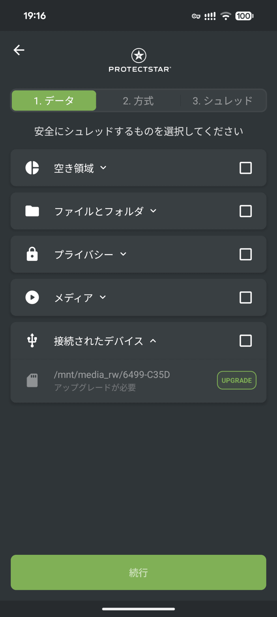 具体的にはハードディスクとスマートフォンをUSBケーブルで接続した後、iShredderのアプリを起動します。続いてアプリ上で接続したハードディスクを選び、さらに消去方法を選ぶと消去がスタートします。