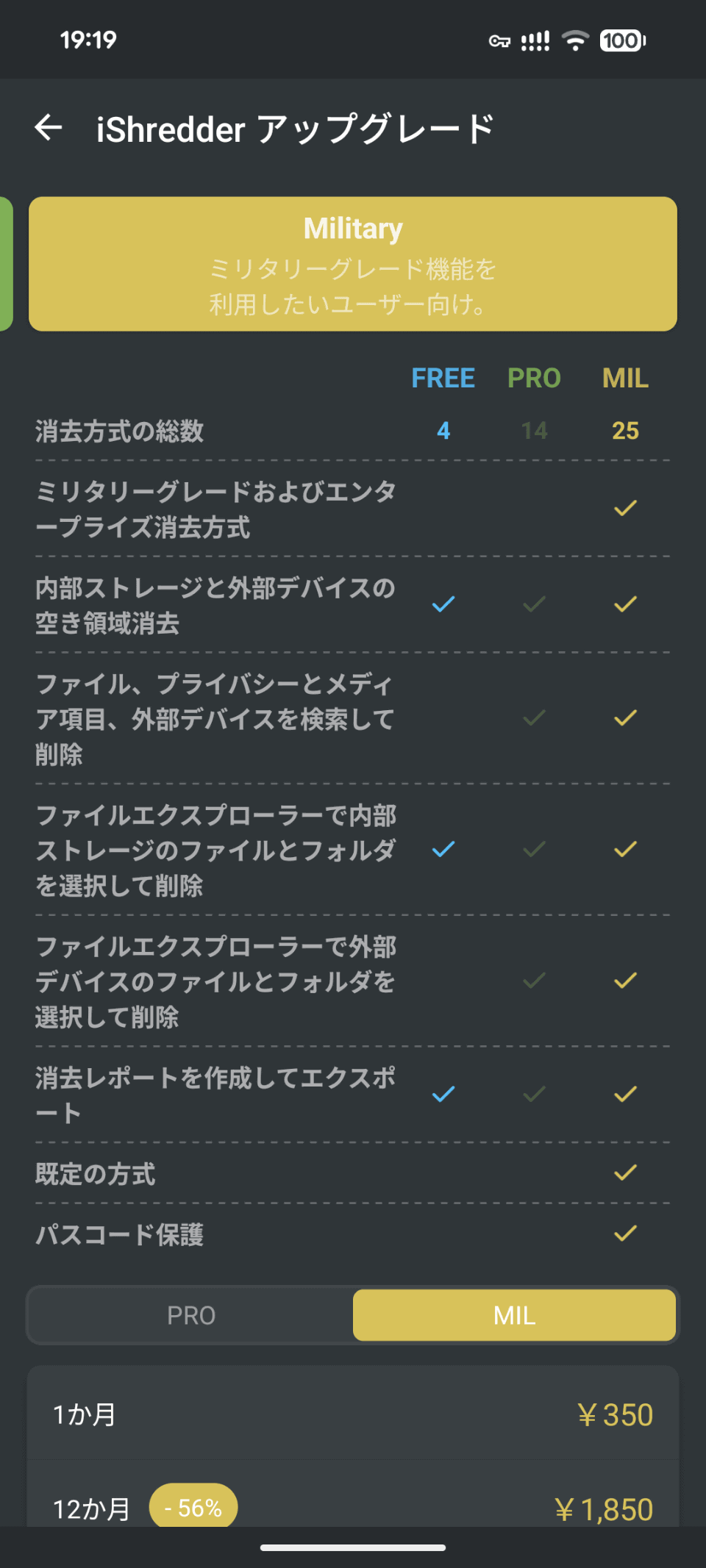 ですが、実際に使ってみたところ、外部ストレージの消去は有料版にアップグレードが必要とのこと。有料版は多くの機能が使える「PRO」とミリタリーグレードの消去ができるという「Military」の2つがあり、月額制であれば前者で250円、後者で350円での利用が可能となっていました。