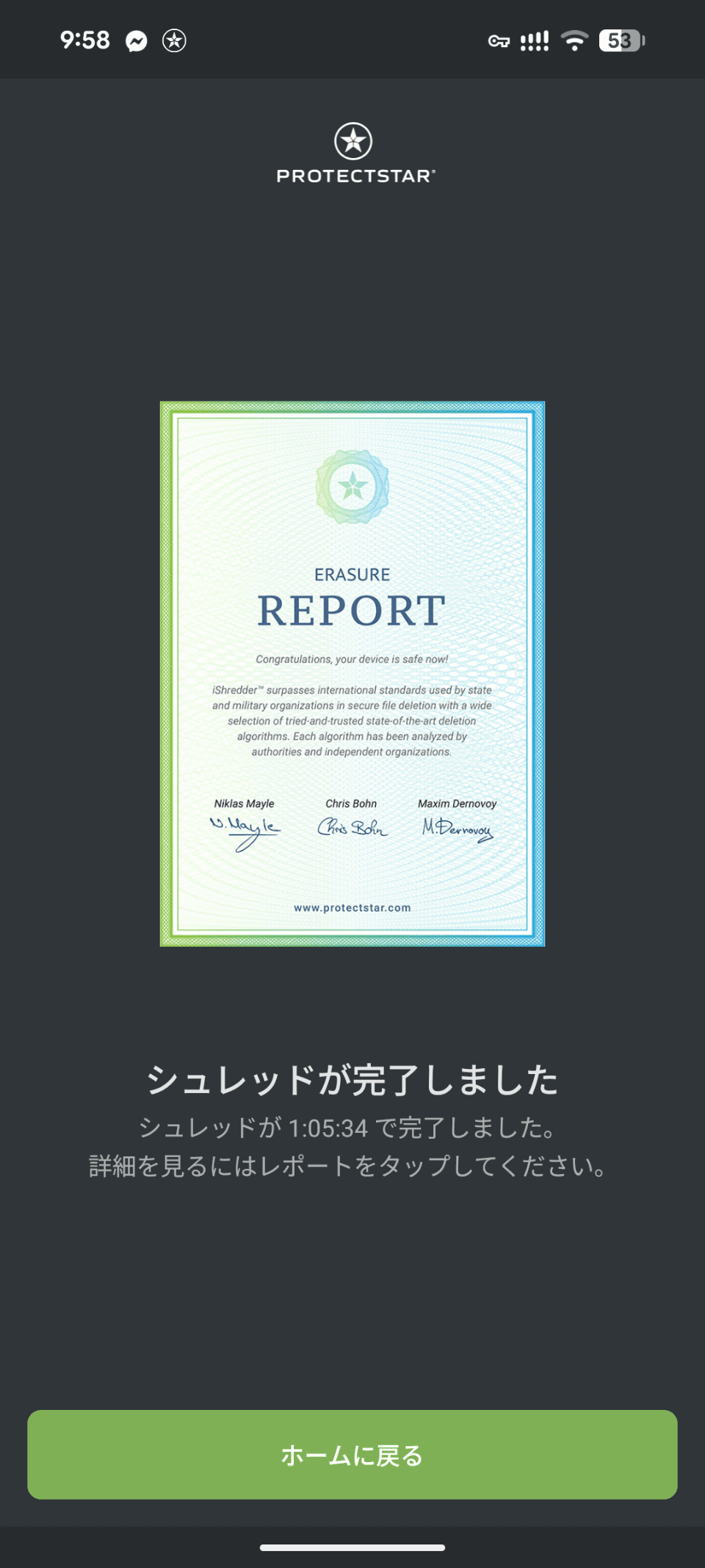 しばらく待って消去が終わると完了画面が現れるのですが、500GBのハードディスクの消去をするのにかかった時間は1時間ほどでした。当然消去方法を変えるとより時間はかりますが、スマートフォンがスリープ状態に入っても消去を継続してくれるので安心です。